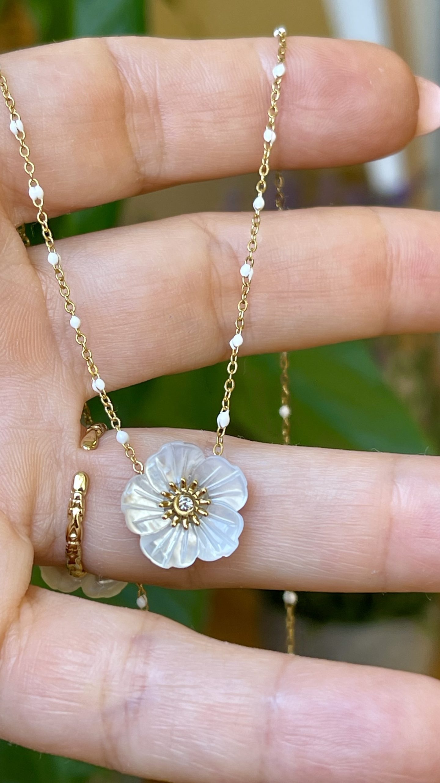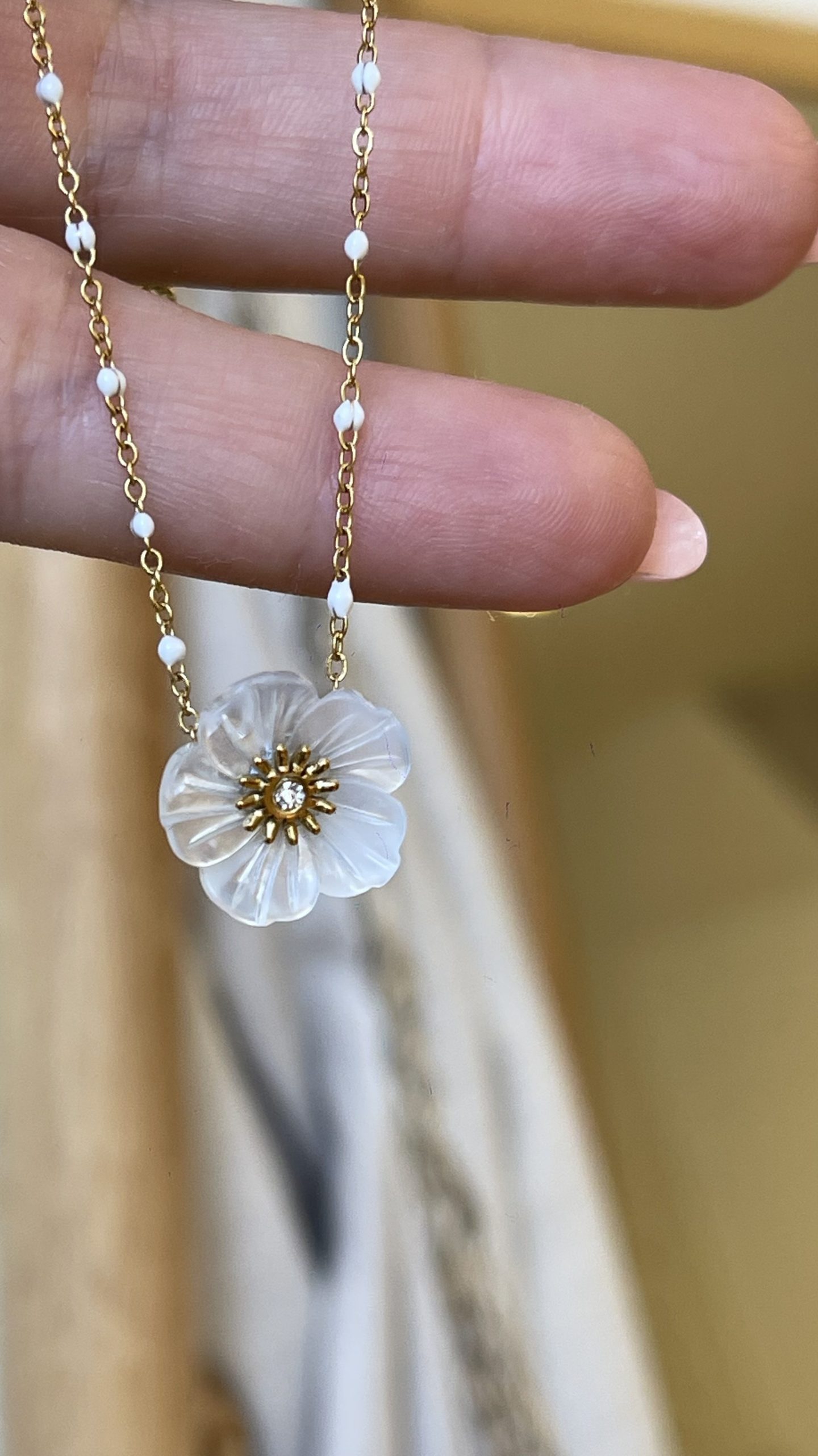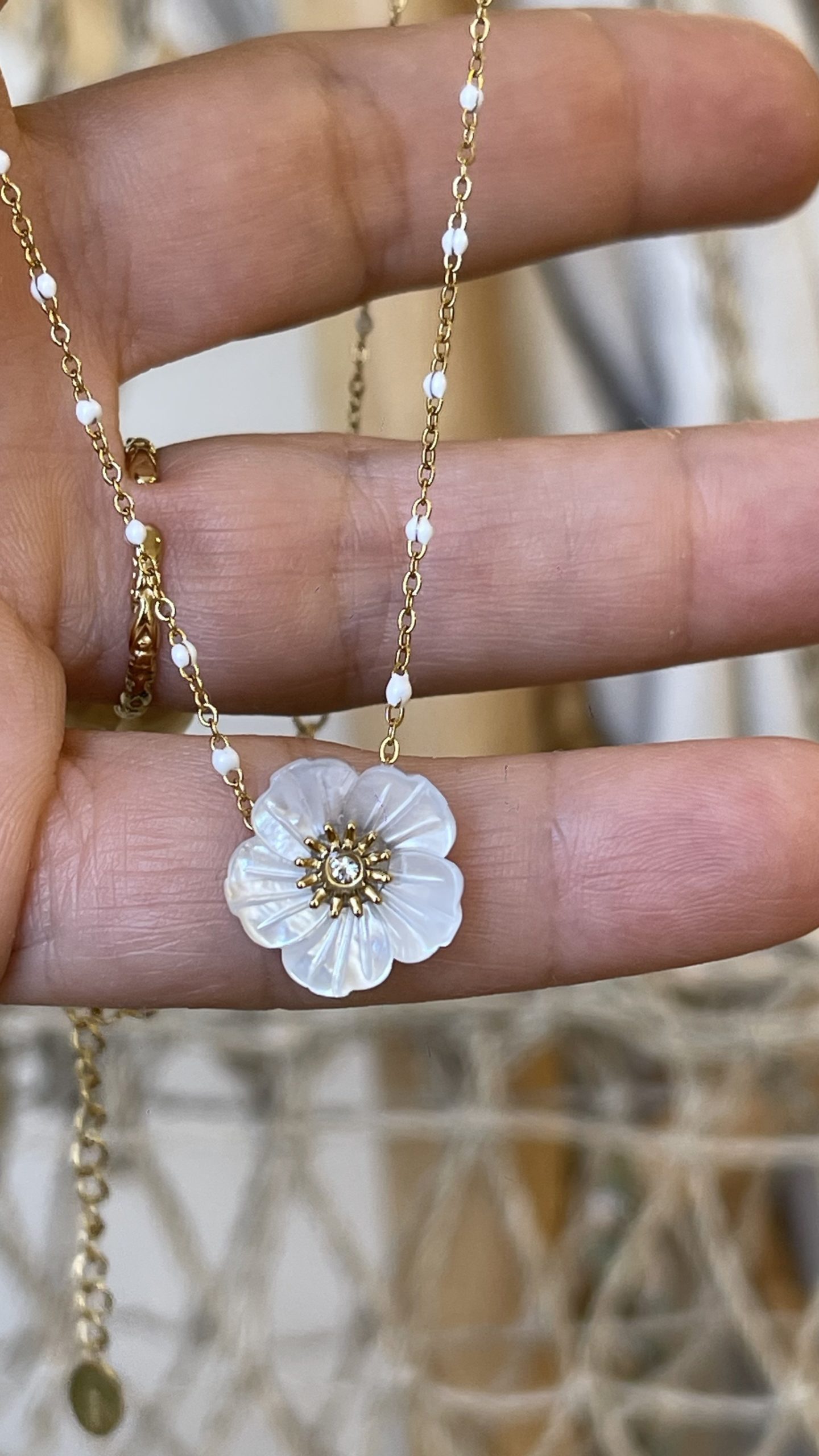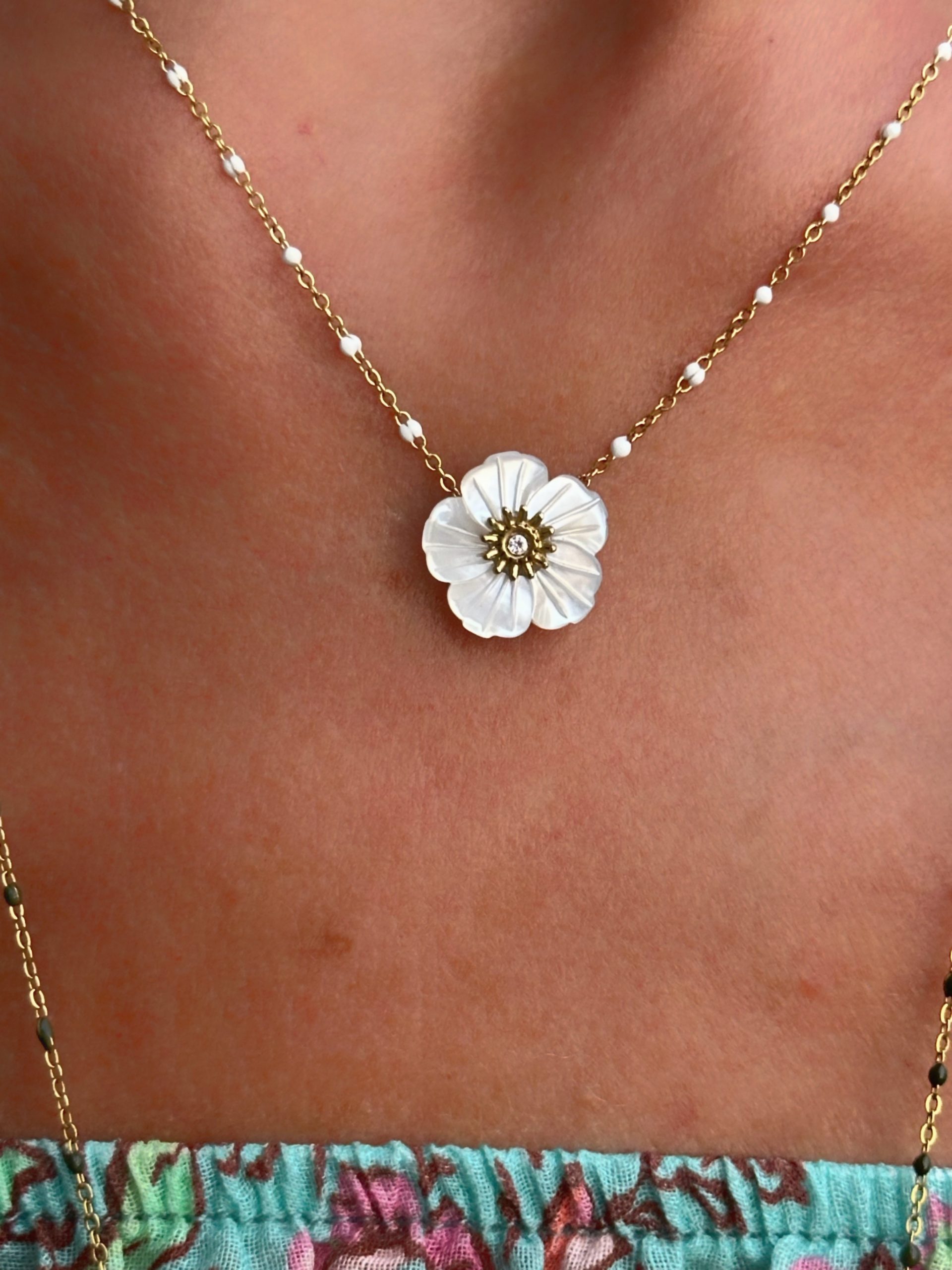 Le magnifique collier Bella est en acier inoxydable et sa fleur en véritable nacre. Les petite goutes blanches en émail sur tout le pourtour apporte encore plus de féminité et de caractère au bijou