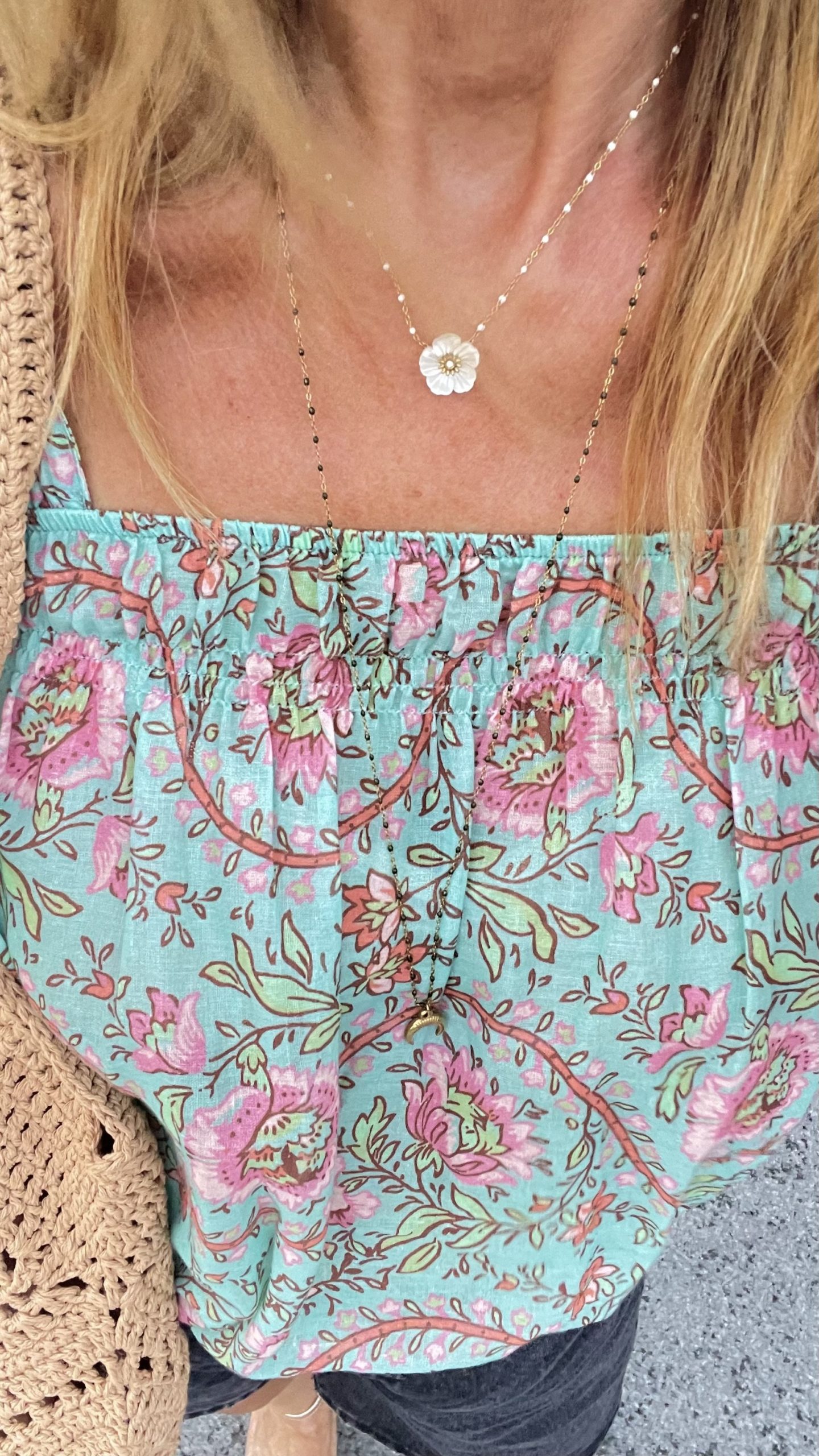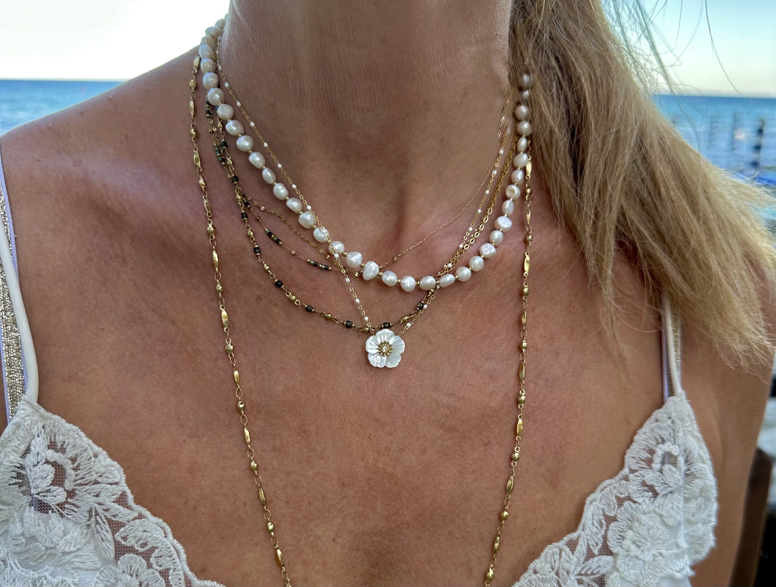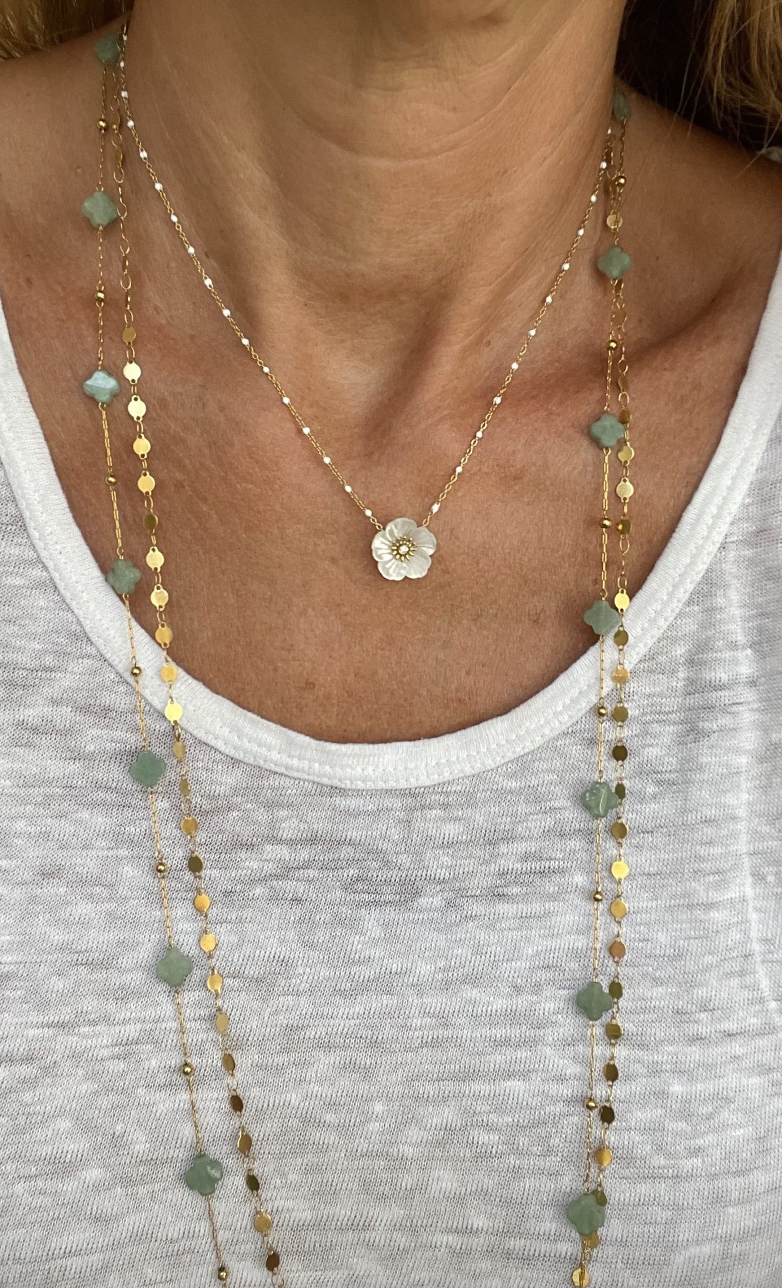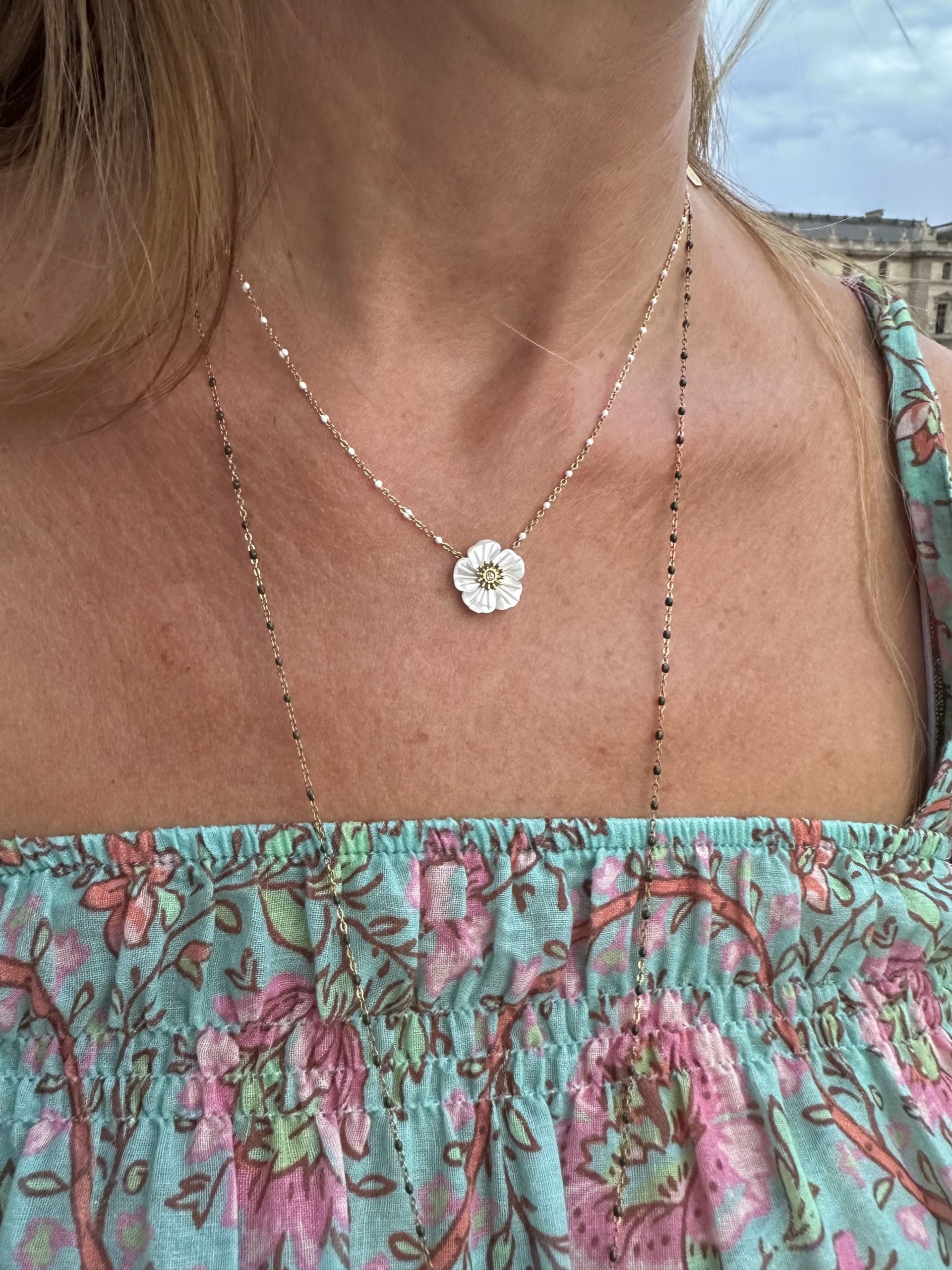 Le magnifique collier Bella est en acier inoxydable et sa fleur en véritable nacre. Les petite goutes blanches en émail sur tout le pourtour apporte encore plus de féminité et de caractère au bijou